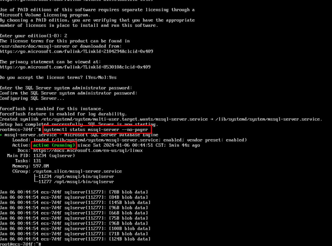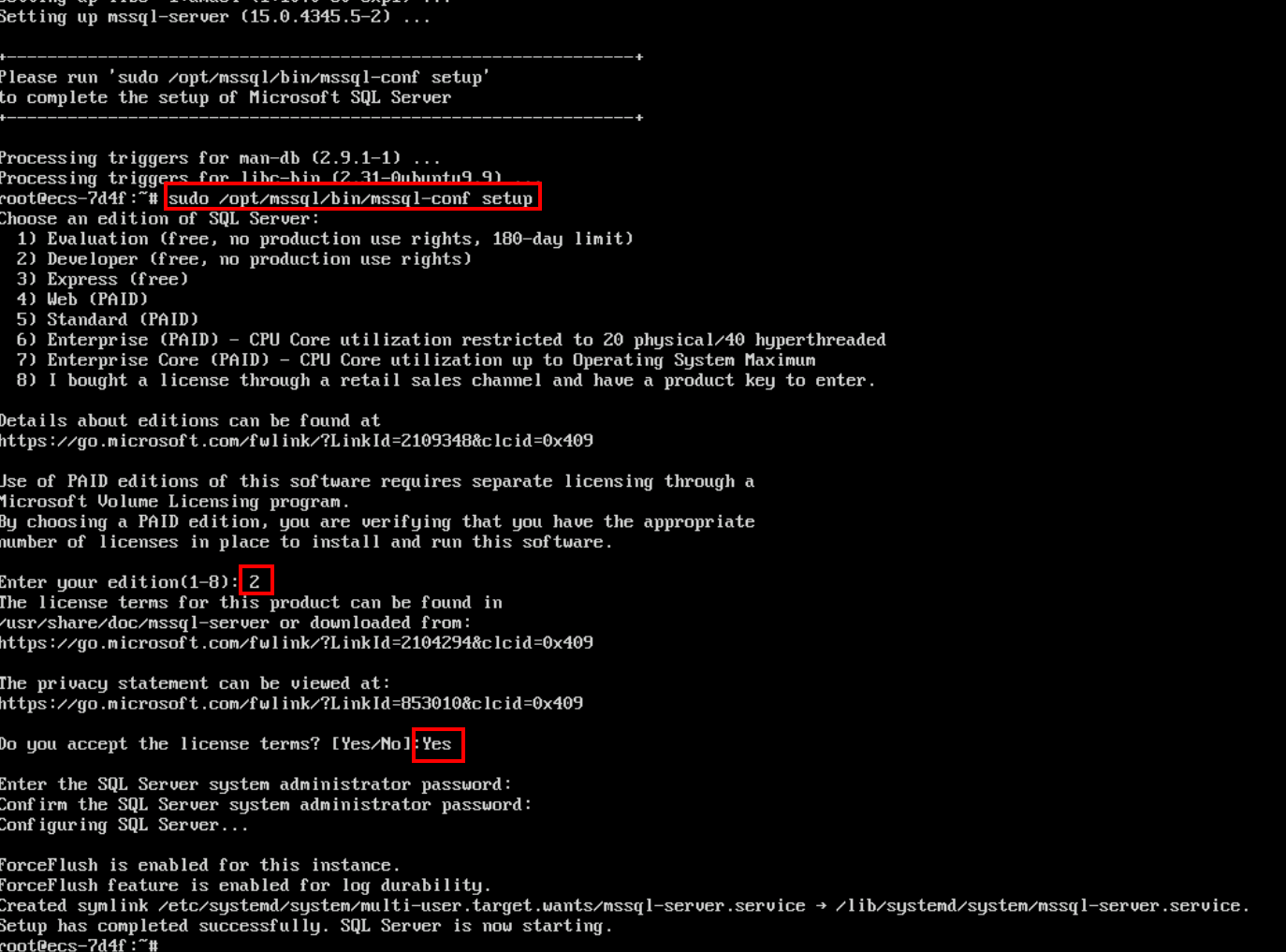 Select the SQL Server edition to be installed, accept the terms of service, and set a password for the SQL Server administrator account.