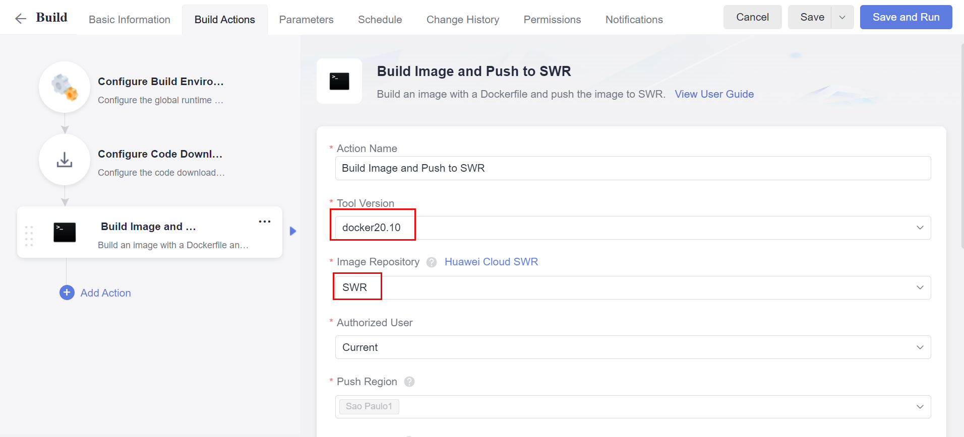 Click on the “Build Image and Push to SWR” build step, select the desired Docker version, the image repository as SWR, and the organization created in item 3.0 of this document.