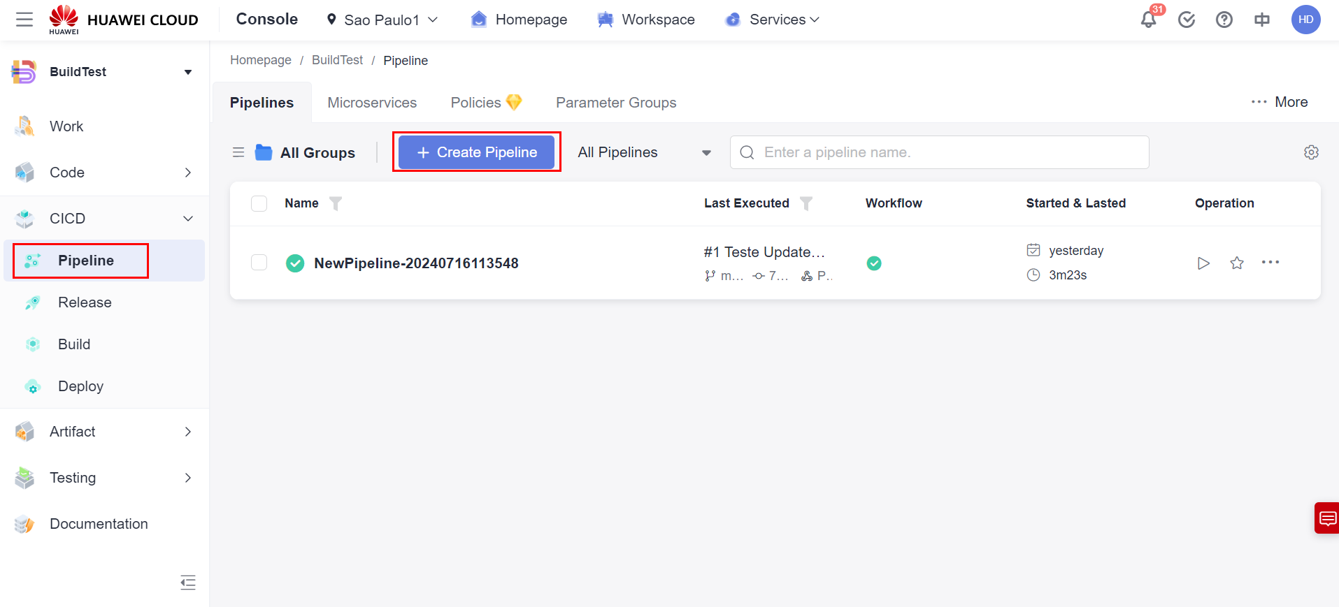 Navigate to the CodeArts Pipelines service section in the Huawei Cloud console and click “Create Pipeline”.