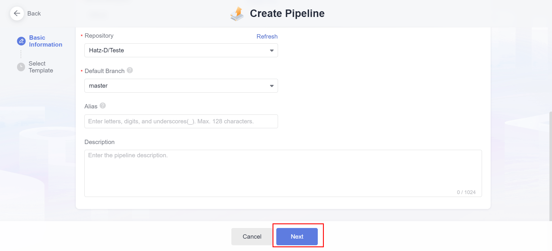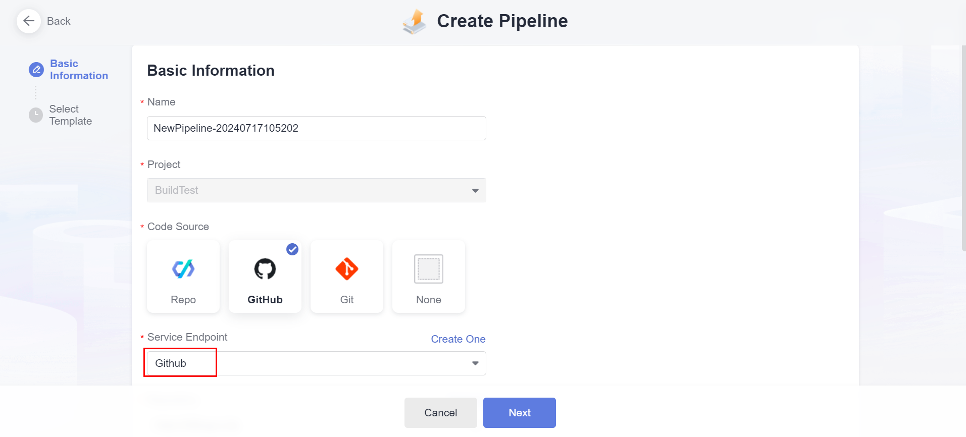 Set a name for the pipeline, the service where the Dockerfile source code is located, and the endpoint created in item 4.1 of this document.