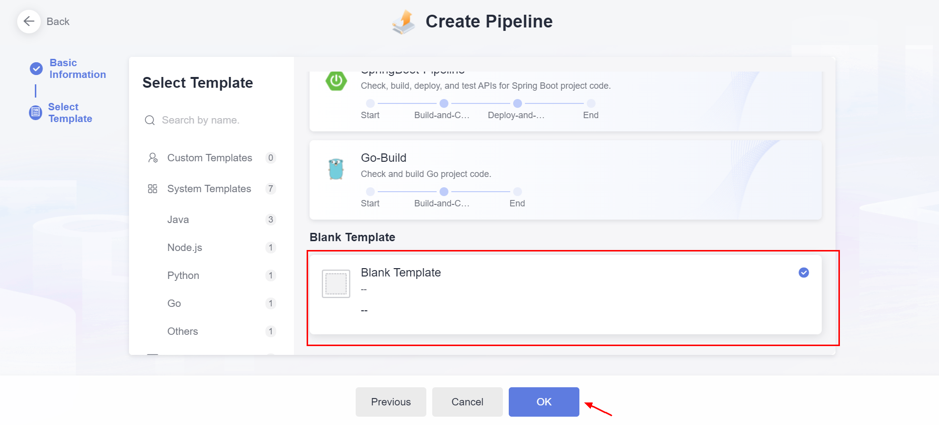 Also configure the repository where the source code is located and its branch. Click “Next” to proceed and select the “Blank Template” template.