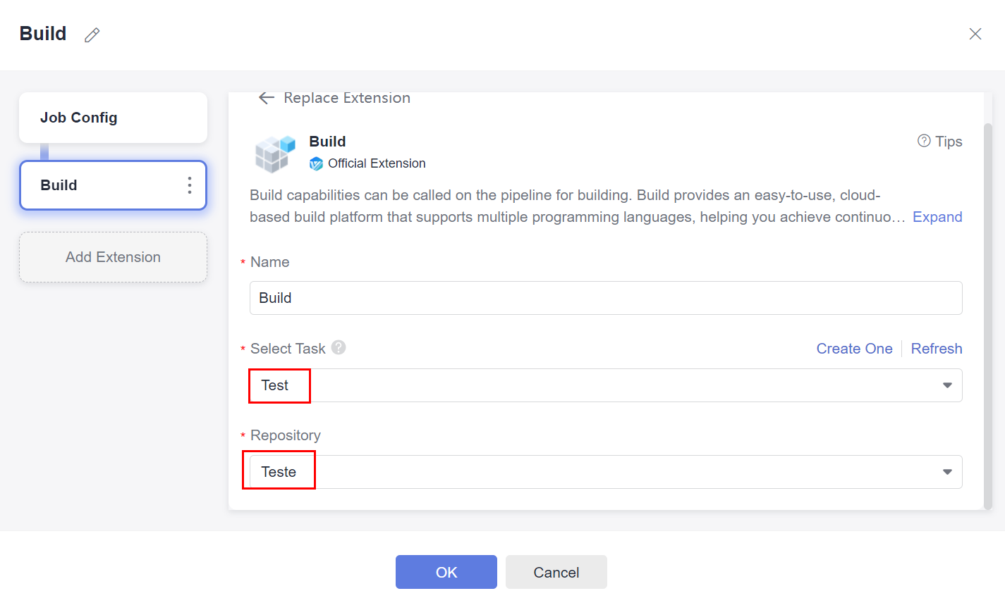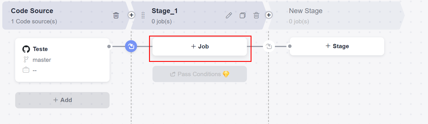 In “Stage_1”, delete the existing “New Job” and create a job for Build. In the Build stage configuration, associate the task created in item 4.2 of this document and the repository where the Dockerfile source code is located.