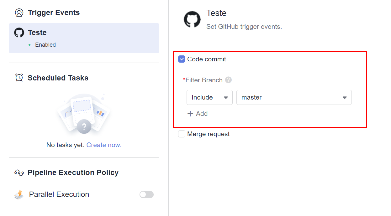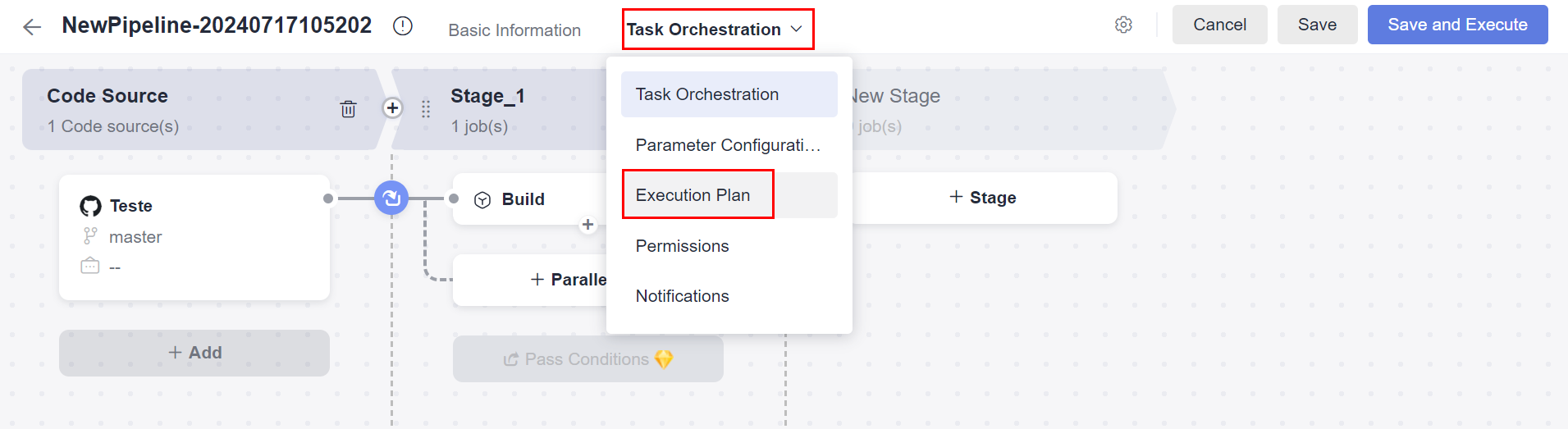 To add a trigger to the pipeline, click “Task Orchestration” above and select the “Execution Plan” option. Select the trigger type, such as code commit or merge request.