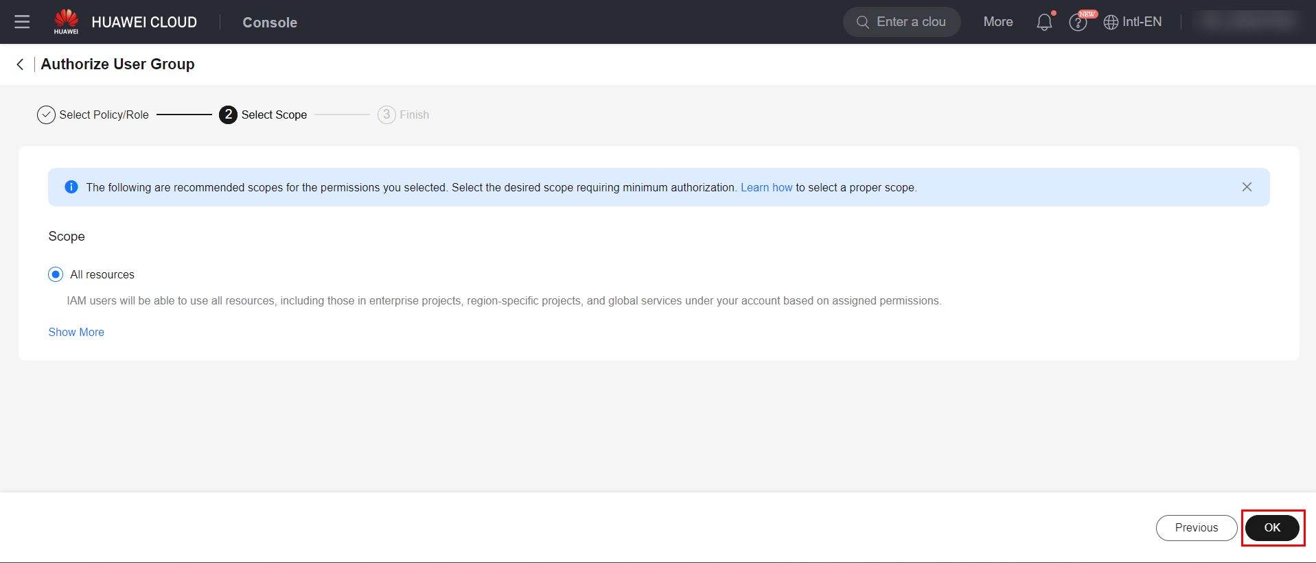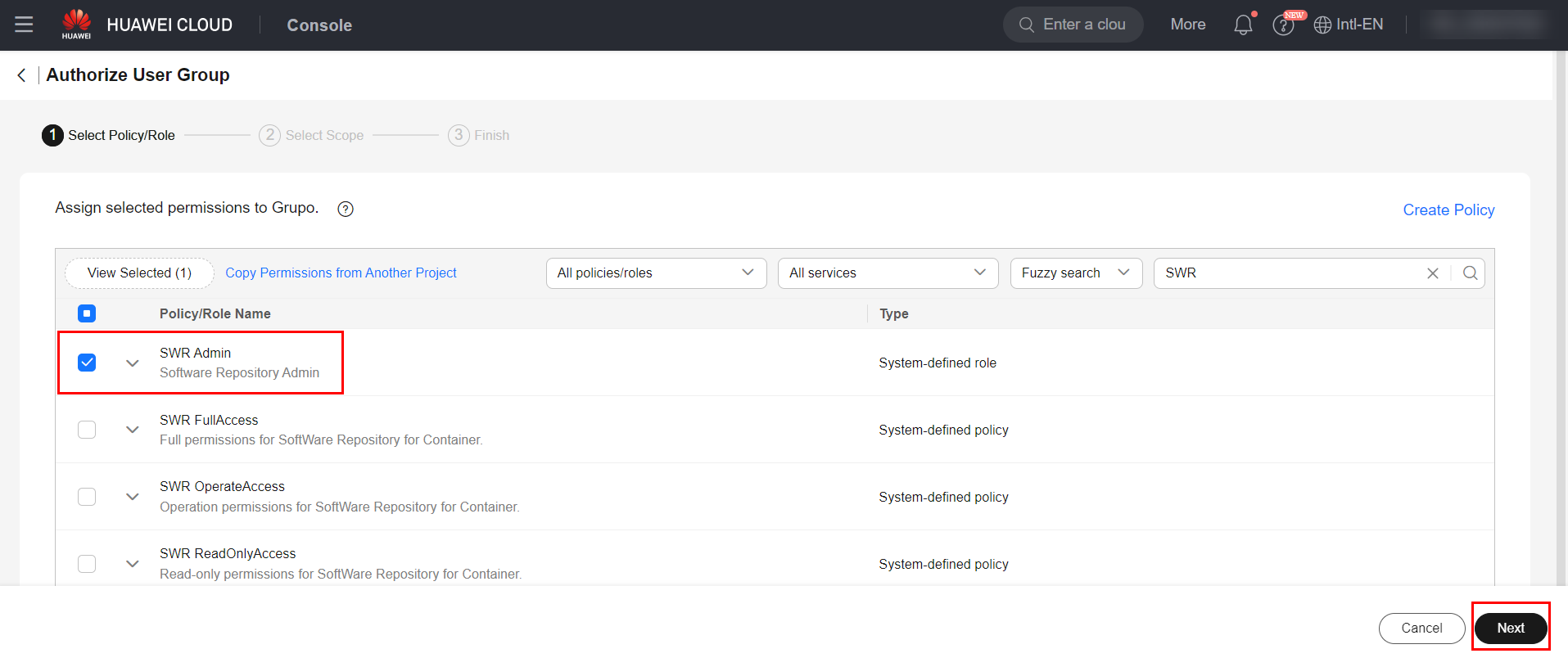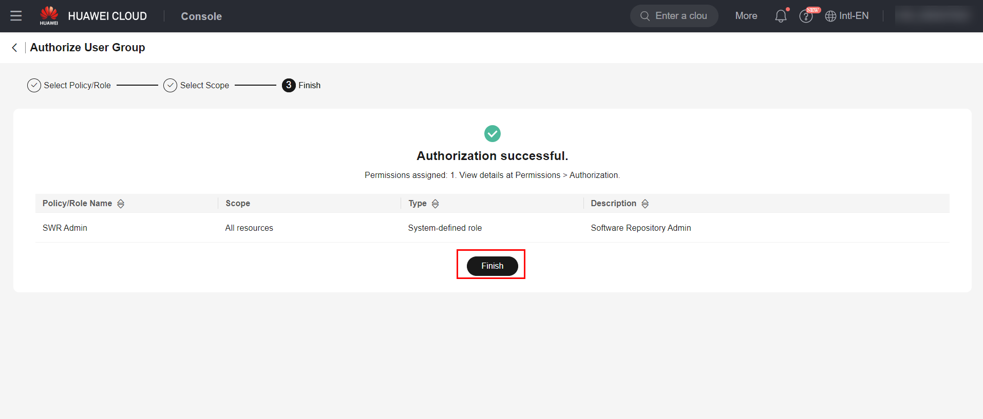 Click “Authorize” next to the created group, select the “SWR Admin” policy, followed by “OK” and “Finish”.