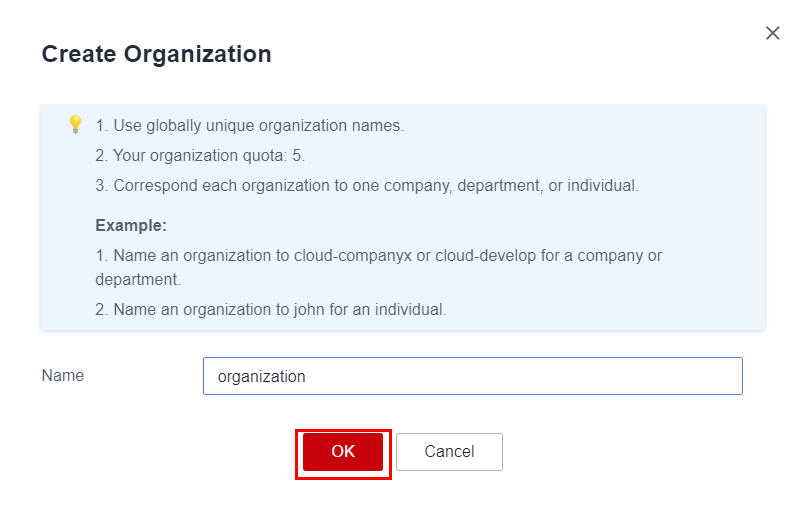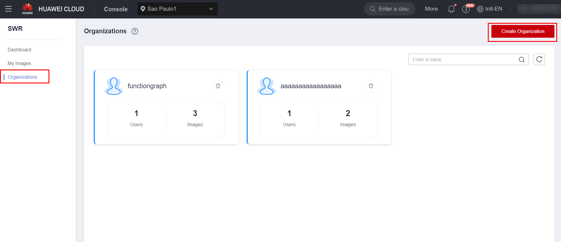 Navigate to the SWR service in the Huawei Cloud console. Click the “Organizations” tab and click “Create Organization”. Give the organization a name and click “OK” to confirm the organization creation.