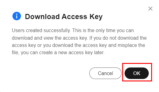 Click “OK” to download the generated AK/SK key, which will be used to create authentication credentials with Docker later.