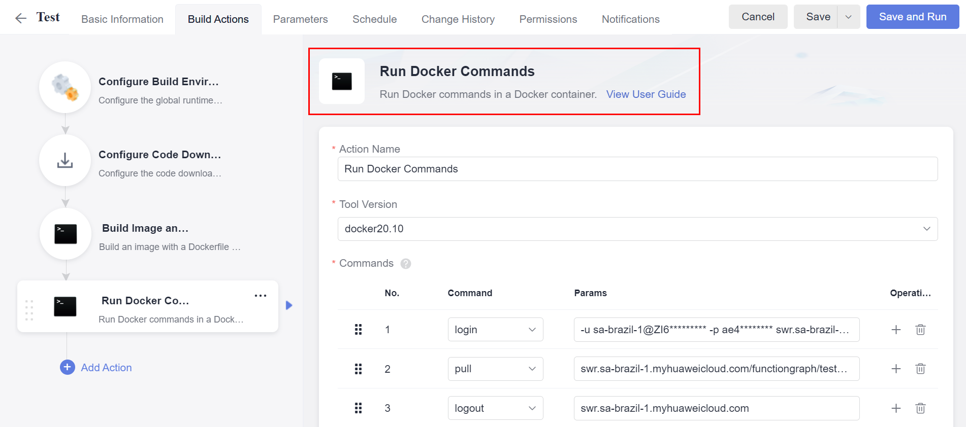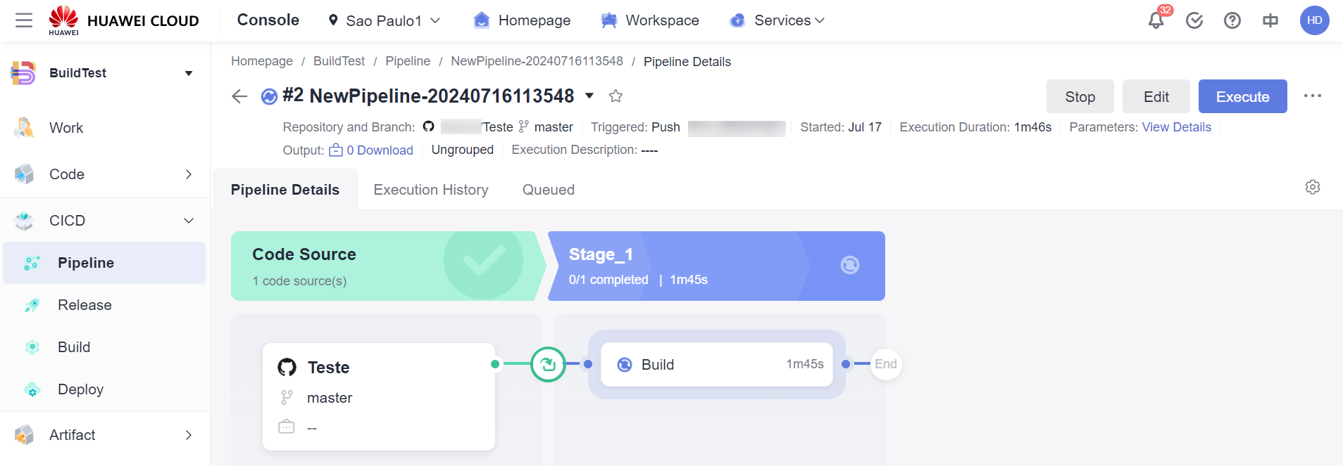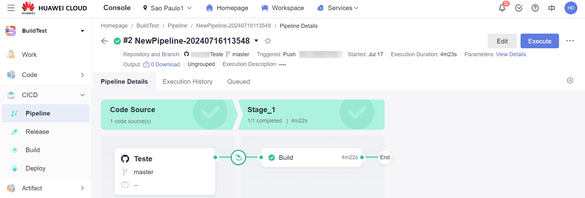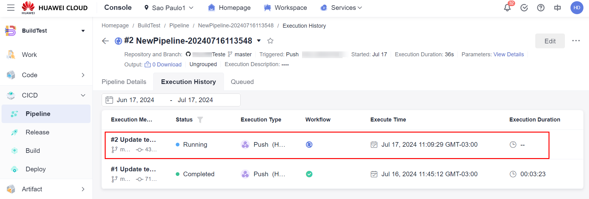 In this example, a pipeline was created so that every time a commit is made to the master branch of the specified Test repository, the pipeline will be activated and will build the Docker image according to the Dockerfile in the repository, upload it to the Huawei Cloud SWR repository, and consequently update the FunctionGraph function.