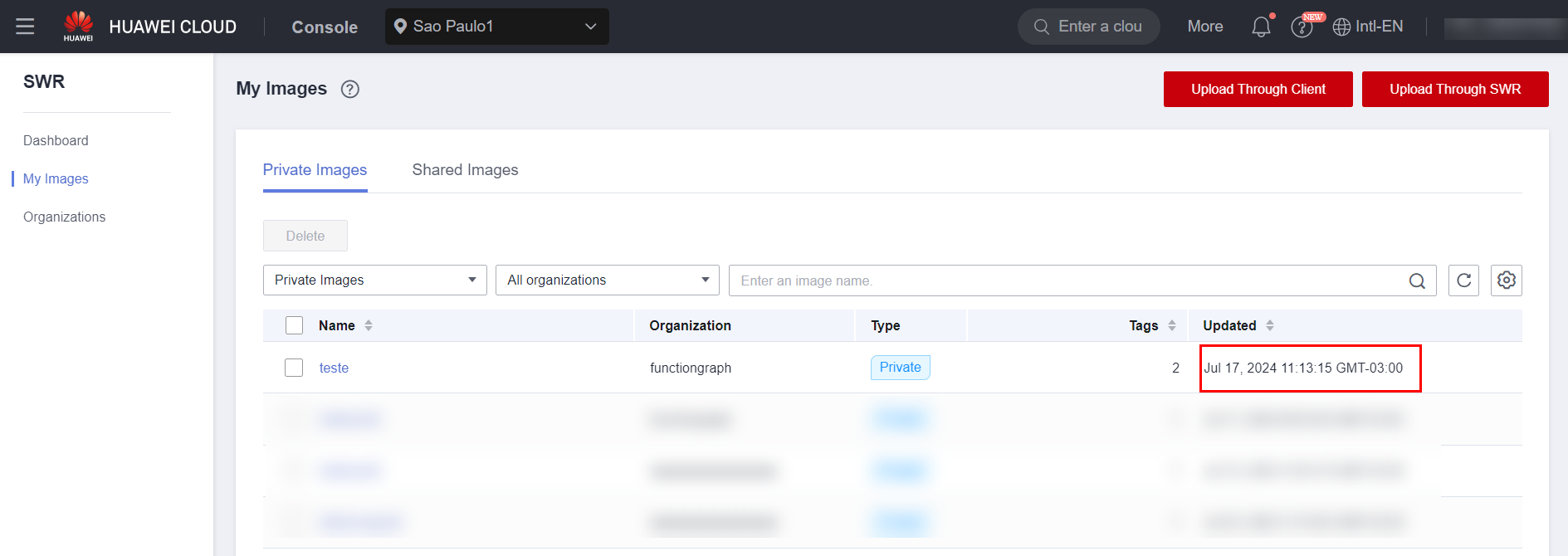 On the SWR service page in the HWC console, you can see that the image was successfully published to the repository: