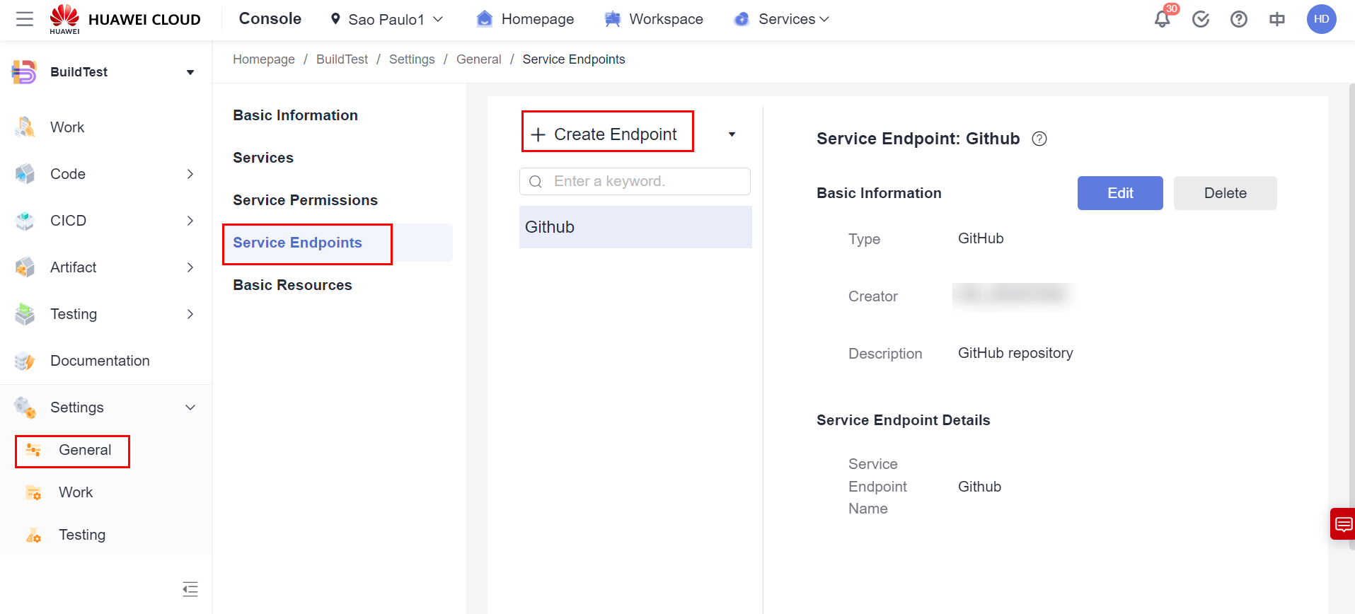Navigate to the CodeArts Req service in the Huawei Cloud console. If this is your first time logging into the service, you will be prompted to create a CodeArts project. Access the settings of the created CodeArts project by clicking on “Settings” > “General” > “Service Endpoints” > “Create Endpoint”. Select the service where the source code related to the Dockerfile is located.