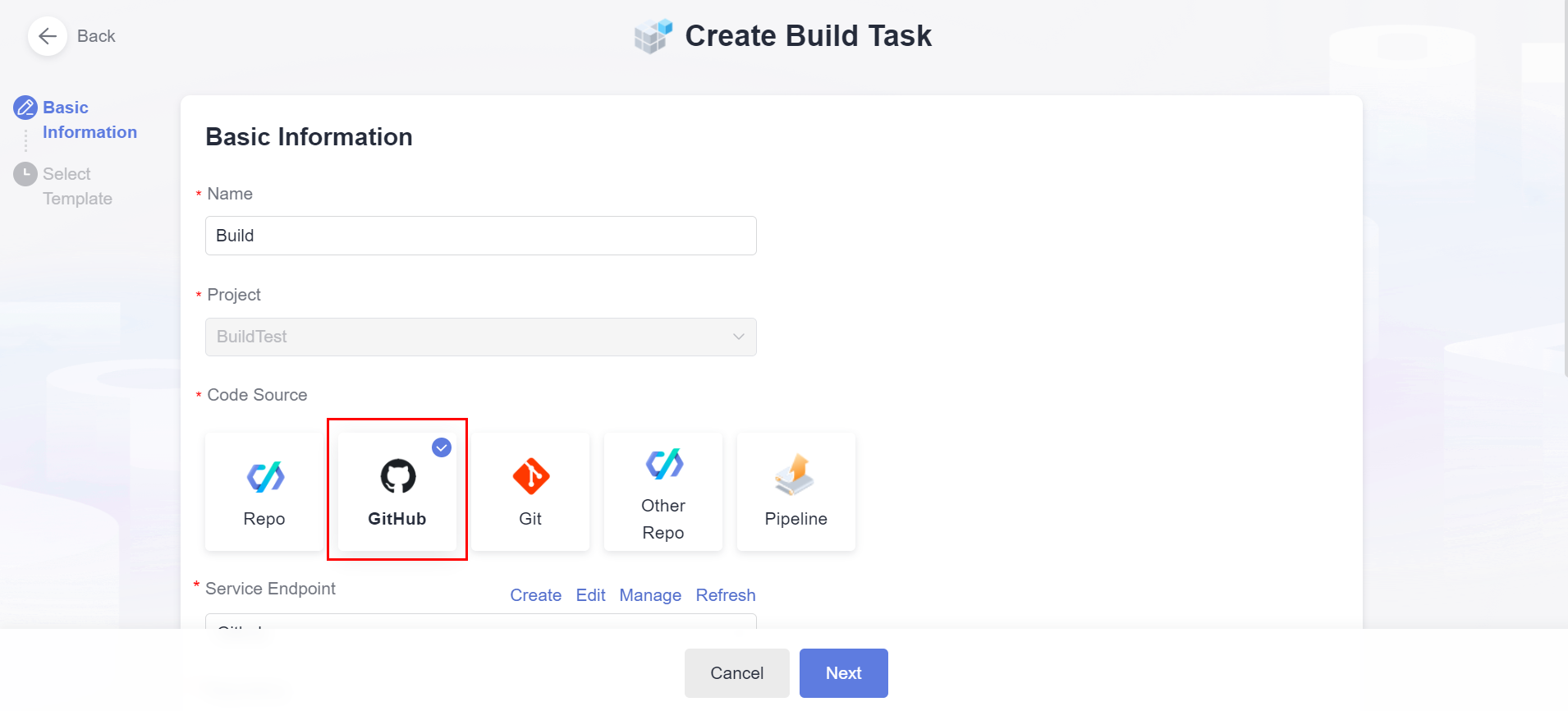 Once the repository endpoint has been created, navigate to the CodeArts Build service and click on “Create Task” to create a Build task. Give the task a name, select the Code Source type where the Dockerfile source code will be located.