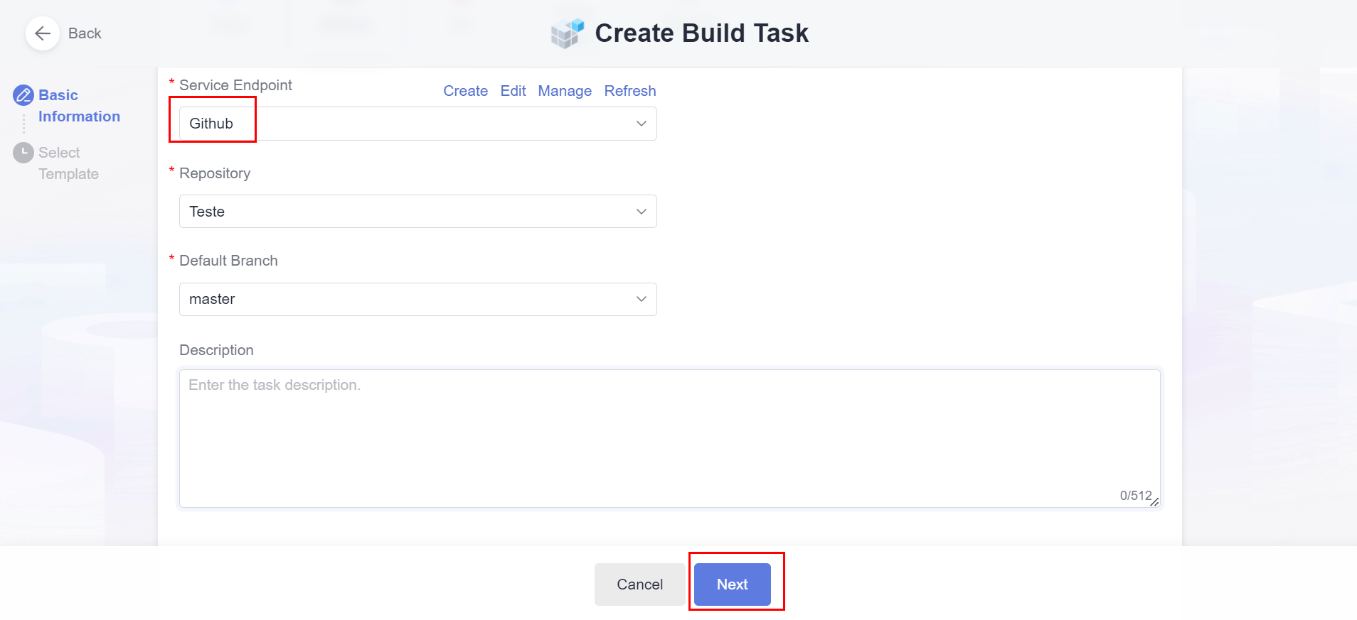 Configure the Service Endpoint created in item 4.1 of this document, select the repository and the repository branch and click “Next”.