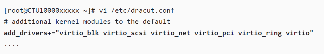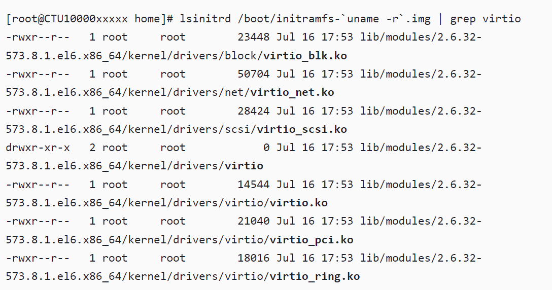 lsinitrd /boot/initramfs-\`uname -r\`.img | grep virtio