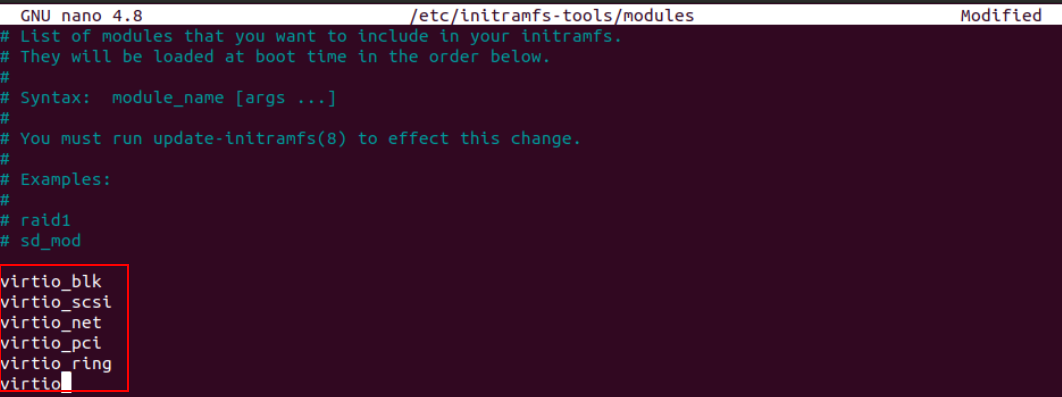 Add the virtio drivers to the file: “/etc/initramfs-tools/modules”: