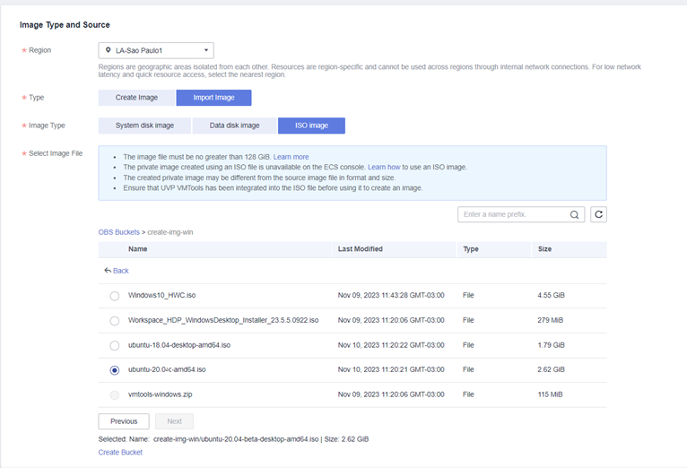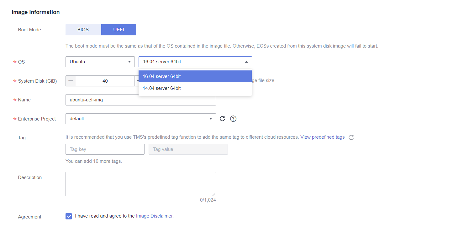 Note: At the time of creating this document, when we select UEFI and Ubuntu, the options for versions 18.04 and 20.04 do not appear, but this was reported to the product team, who informed us and the change will be made in December 2023. At that time, you can select the 16.04 option and the system will work normally.