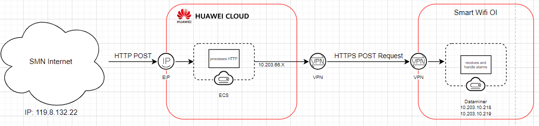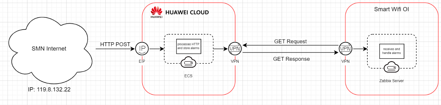 In this first scenario, Simple Message Notification (SMN) will send alarms via the public IP 119.8.132.22 to the EIP located on Elastic Cloud Service (ECS) in our environment. ECS will receive, process, and store these requests. The alarm history will be recorded in the file “alarm_history.txt,” while the last alarm sent will be stored in the file “latest_alarm.txt.”