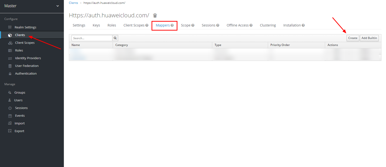 Navigate once again to the “Mappers” section, still in the Huawei Cloud client settings, and click “Create” to create a mapper for the group.