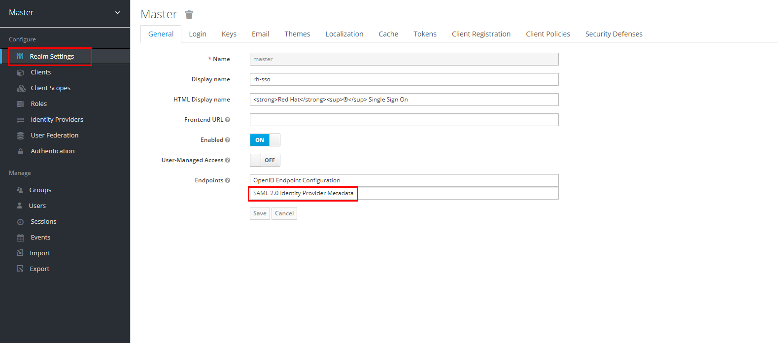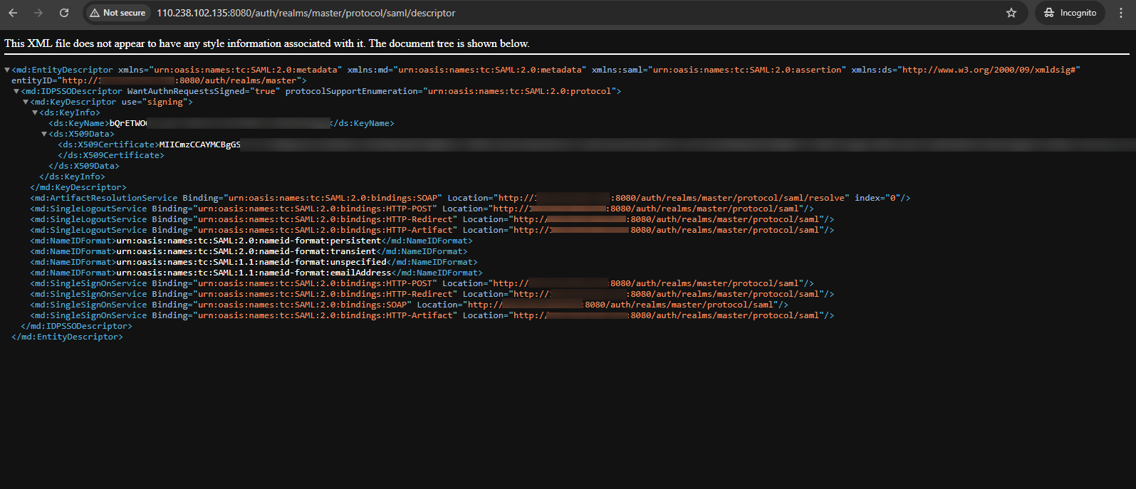 Navigate to the “Realm Settings” section and click “SAML 2.0 Identity Provider Metadata” in the “Endpoints” subsection. Save the opened web page locally as an XML file.