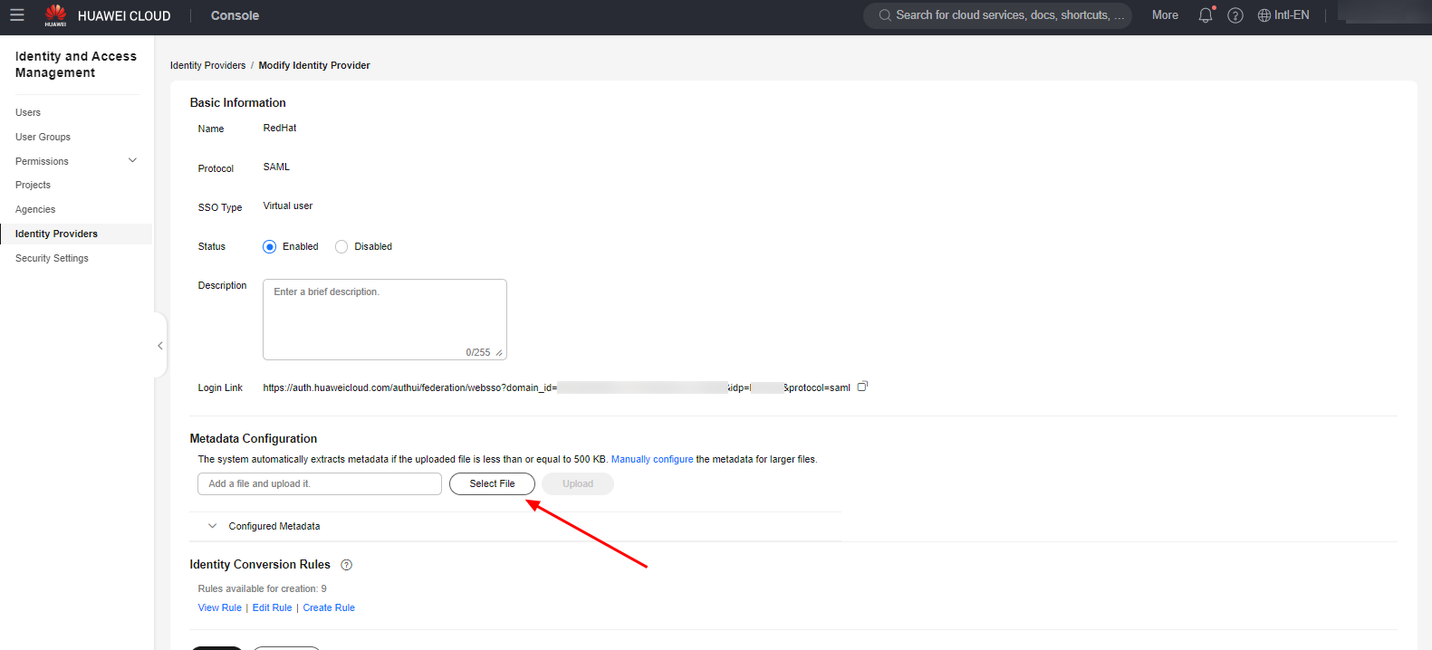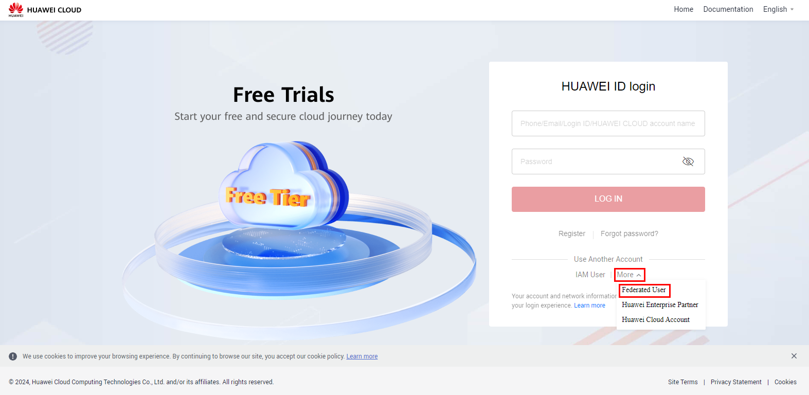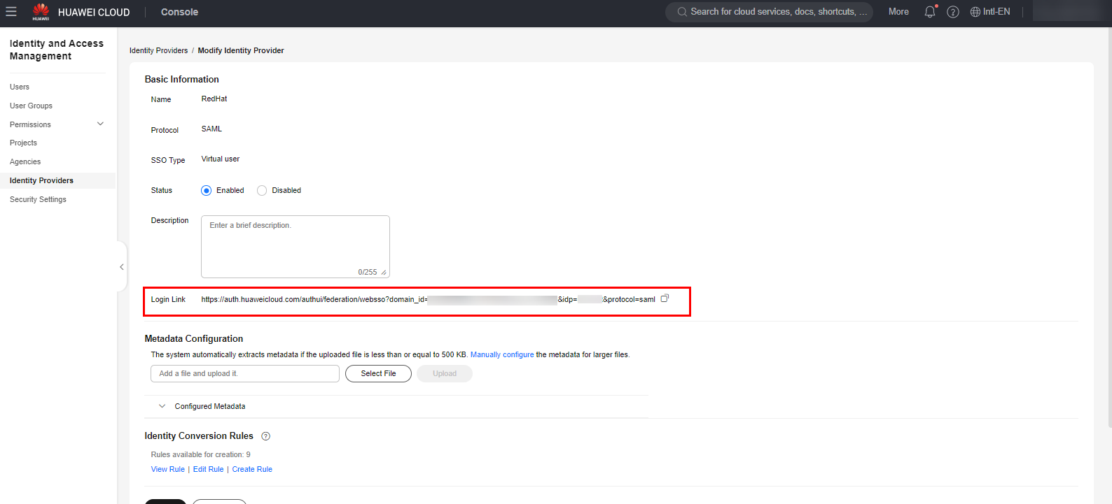 Important: You can also log in to the console via identity federation using the hyperlink generated in the Identity Provider configuration in the Huawei Cloud console.