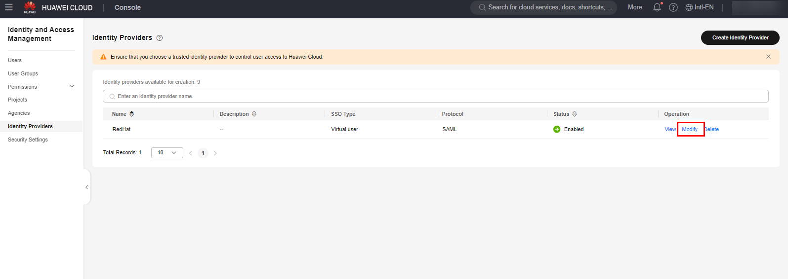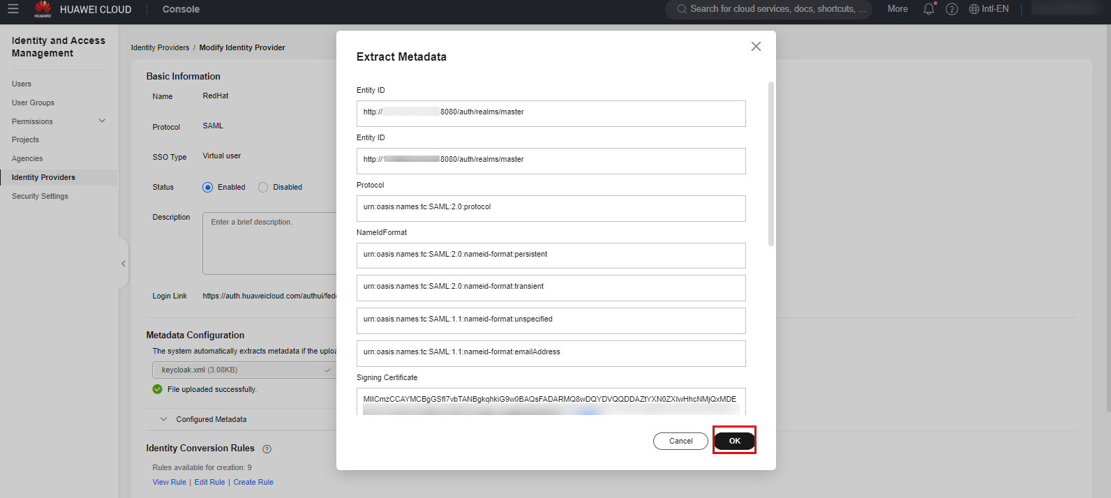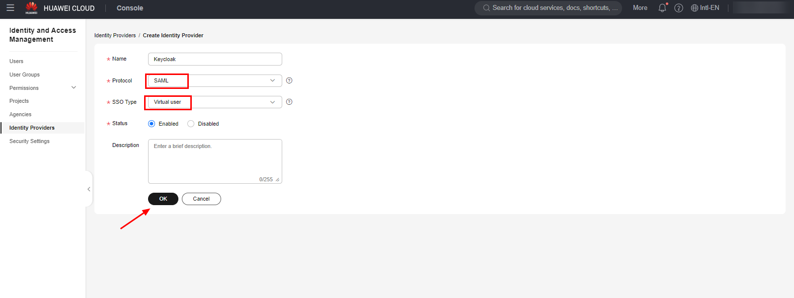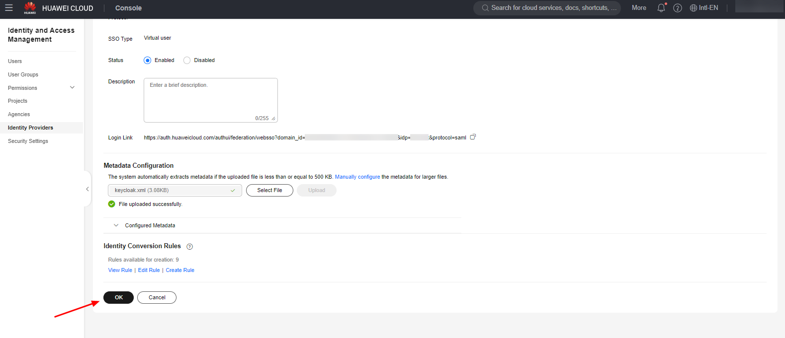 Important: You can also log in to the console via identity federation using the hyperlink generated in the Identity Provider configuration in the Huawei Cloud console.