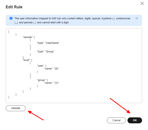 Finally, in the “Identity Conversion Rules” section, click “Create Rule” to create users and groups conversion rule from the IdP to the corresponding users and groups in Huawei Cloud. You can use the example translation rule below.