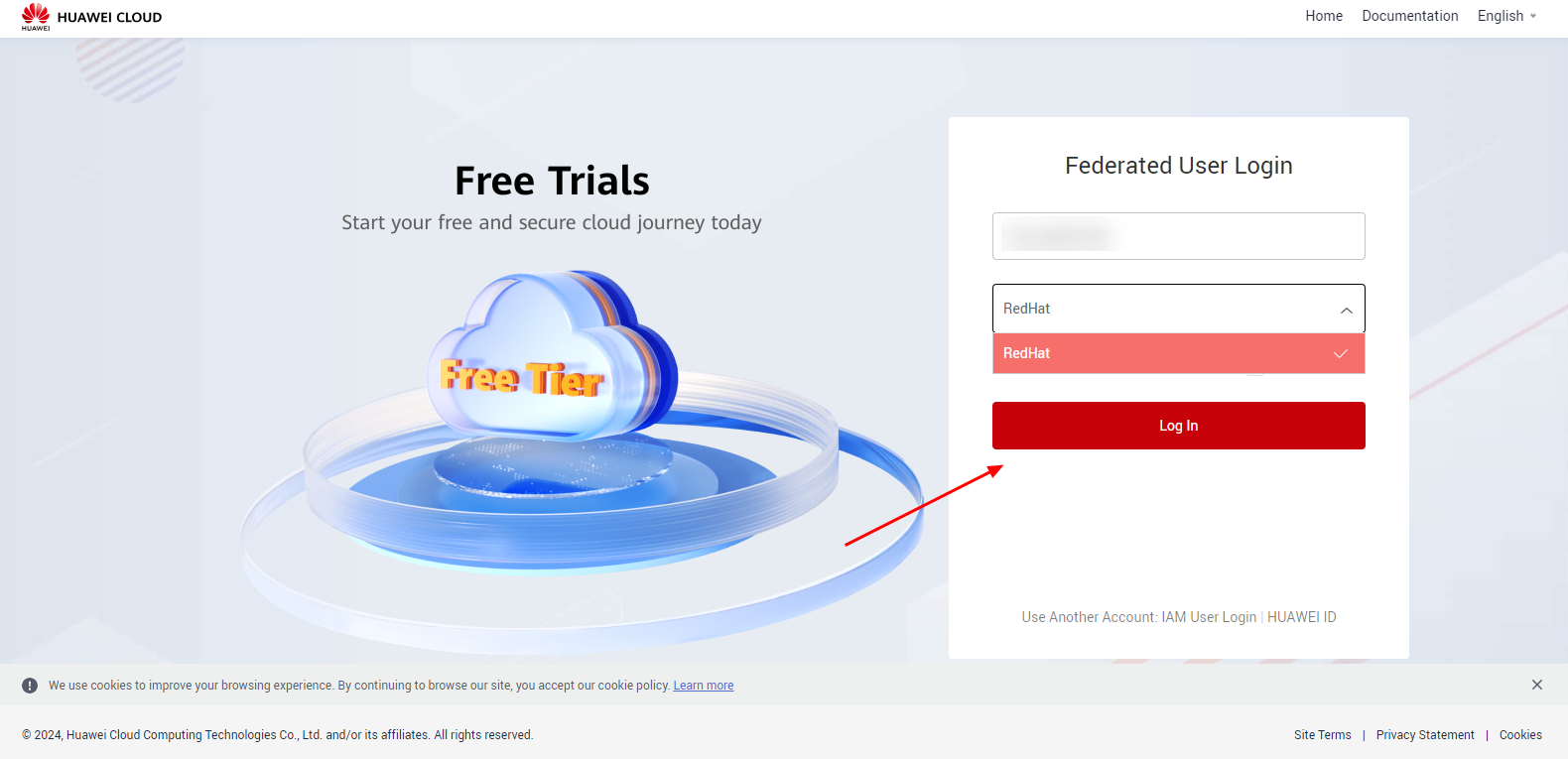 Accessing the Huawei Cloud console and selecting the option to log in through a federated user.