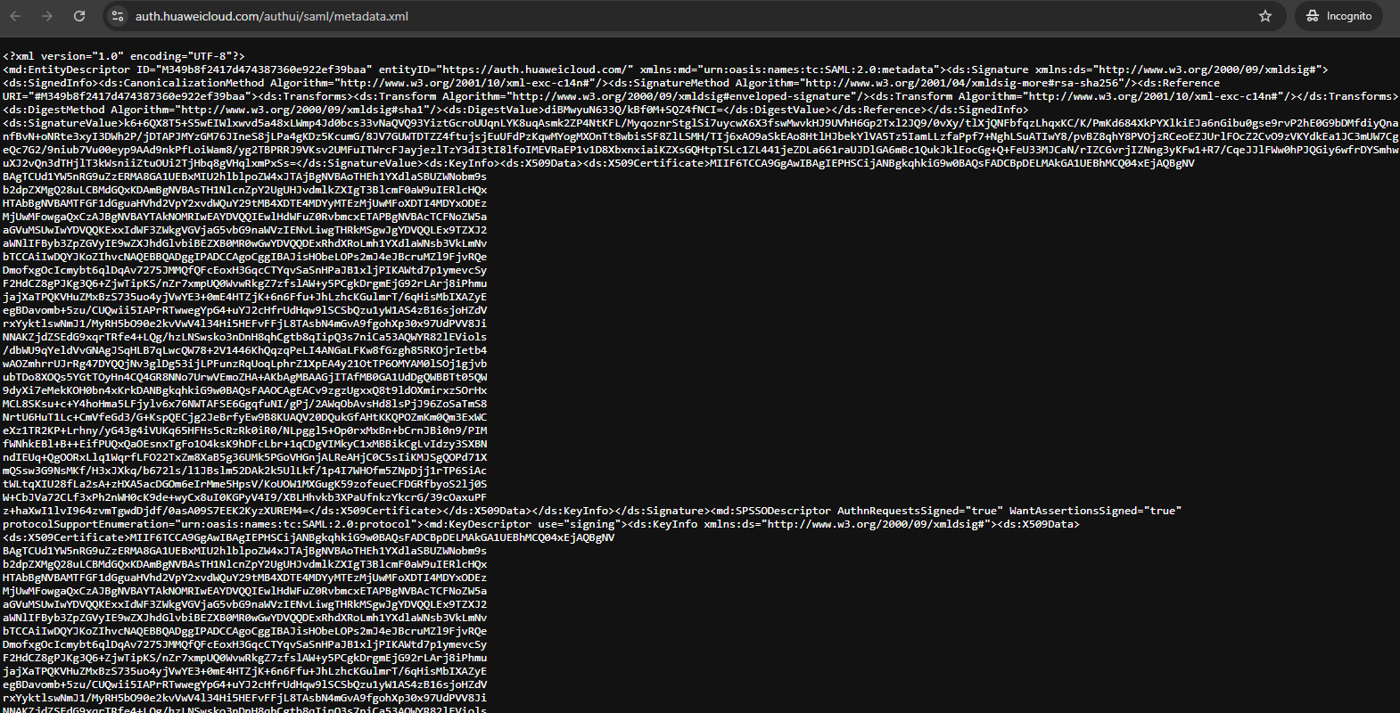 In a web browser, go to the following page and save its contents in an XML file: https://auth.huaweicloud.com/authui/saml/metadata.xml.
