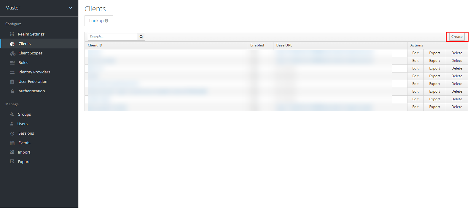 Once done, go to the IdP (Keycloak) settings page and navigate to the “Clients” section. Click “Create” to create a new client.