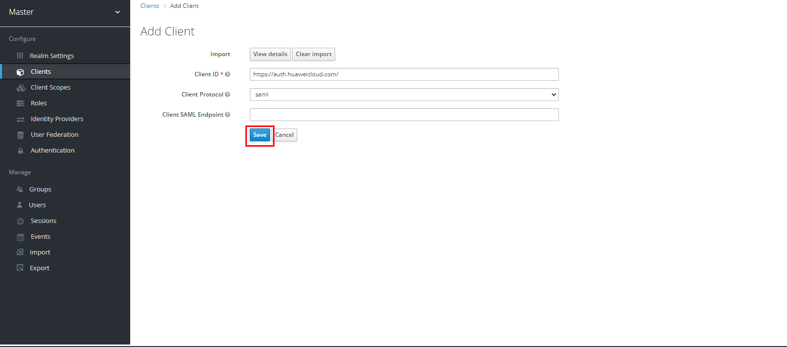 First, you need to obtain the XML configuration file from the Huawei Cloud service provider (SP) to perform the configuration in Keycloak.