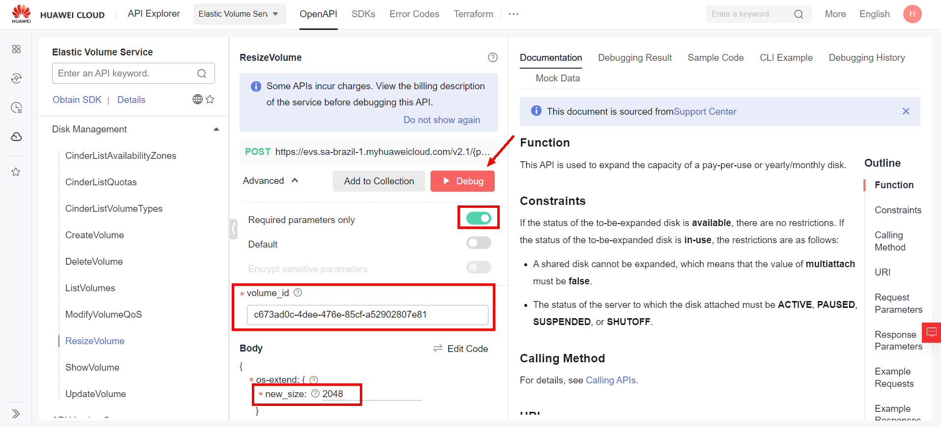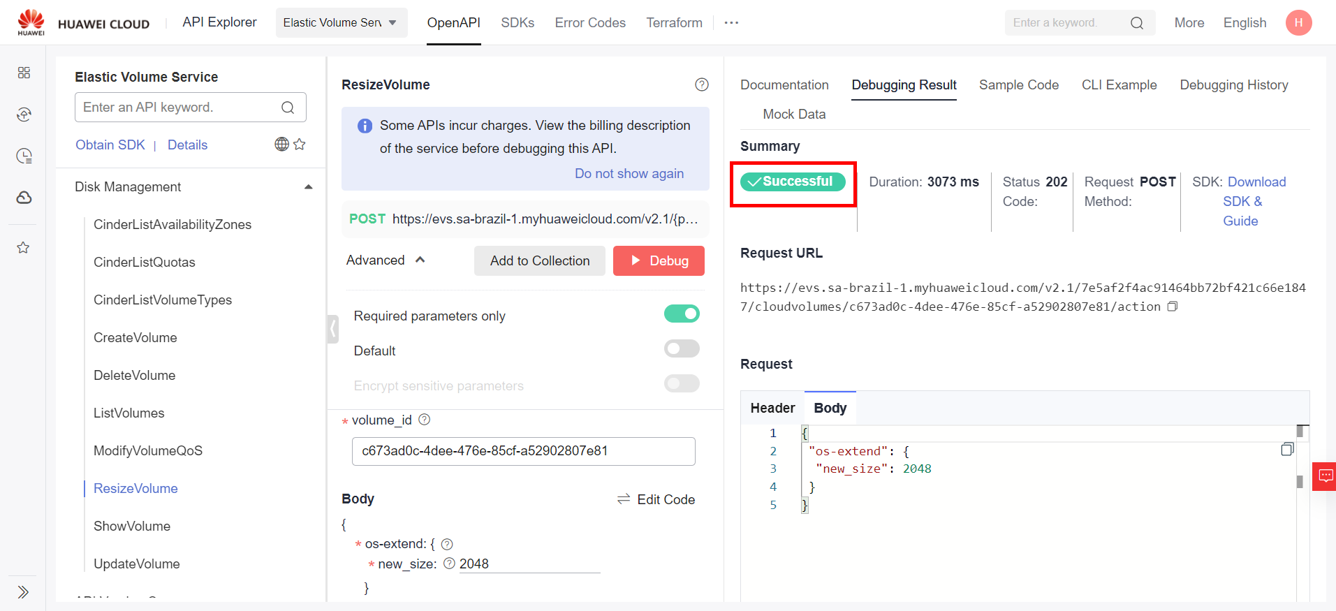 In the API window, fill in the fields in red with the ID of the disk you selected earlier and its new size in GiB. After filling in the blanks, simply click “Debug” and the disk will be resized to the new size: