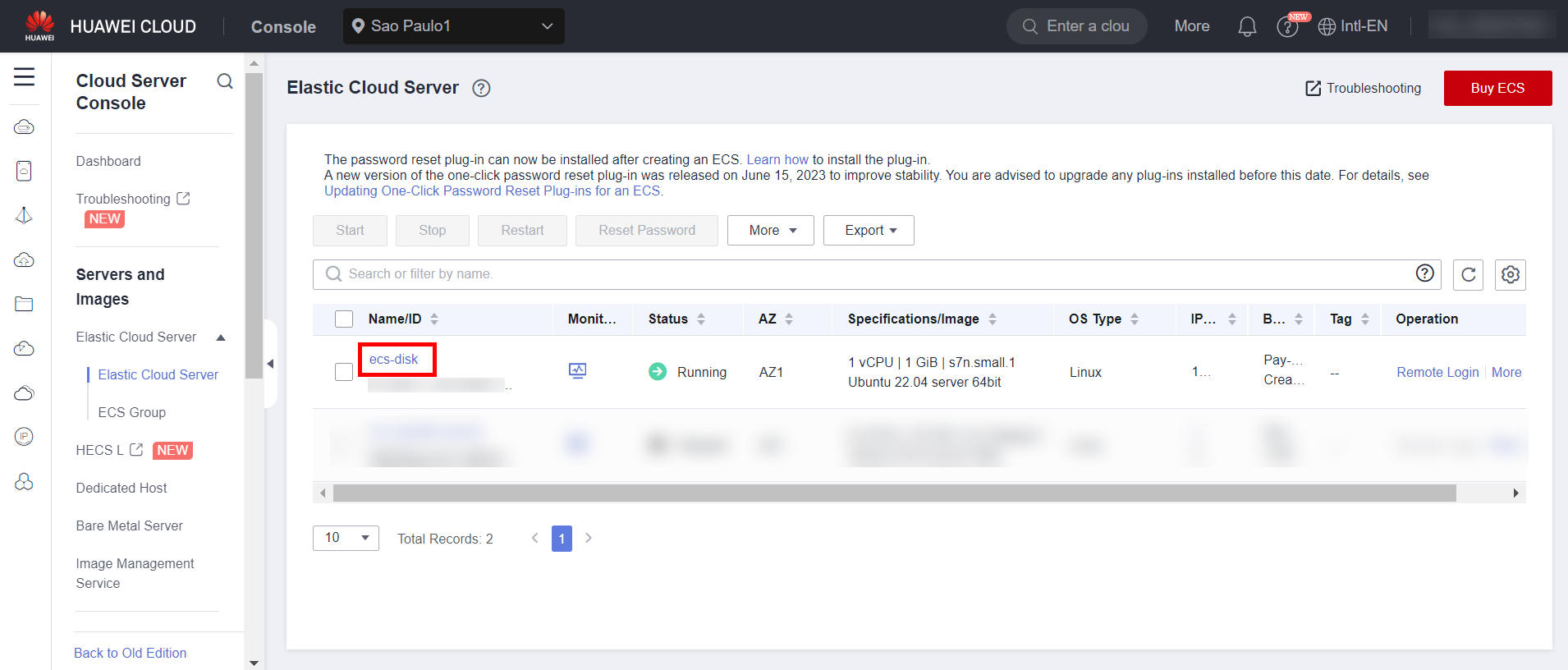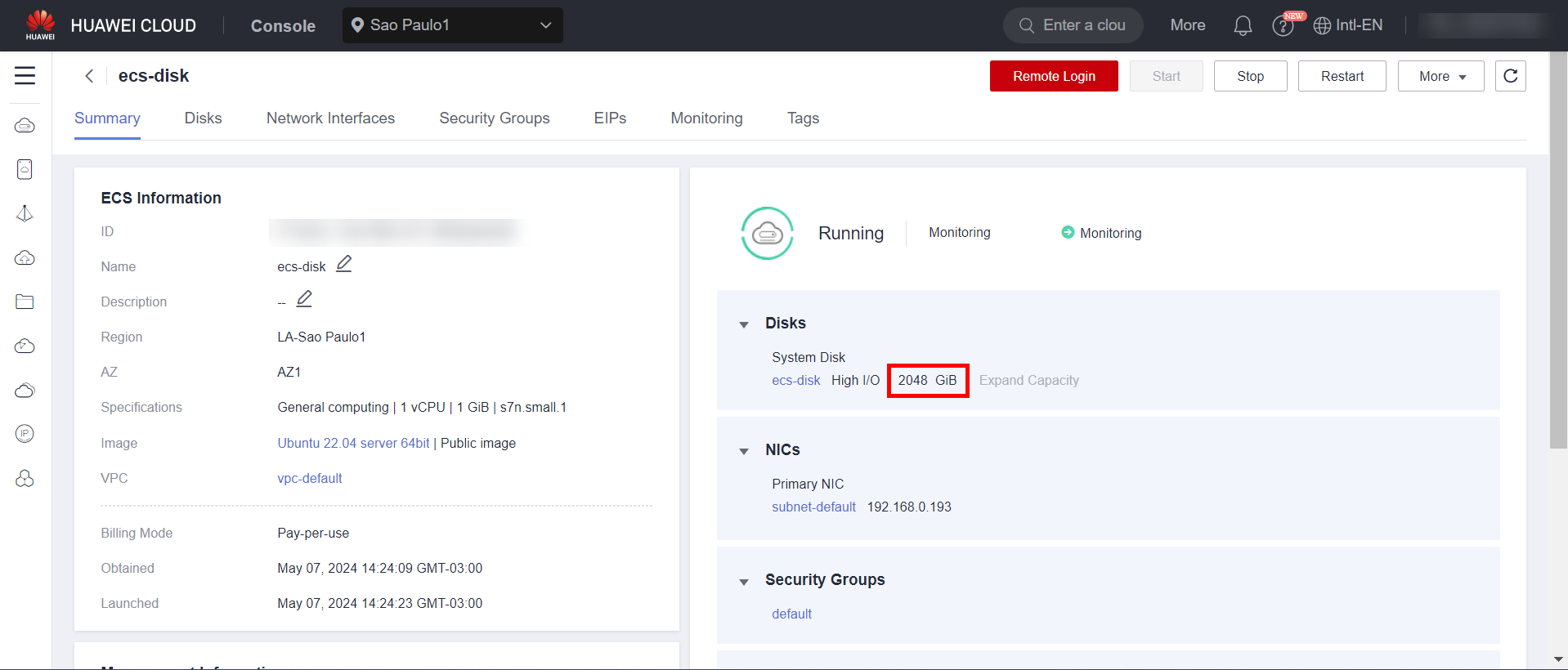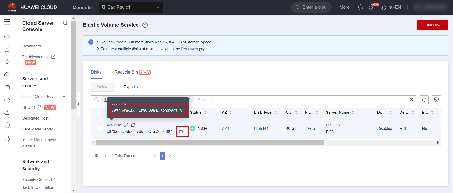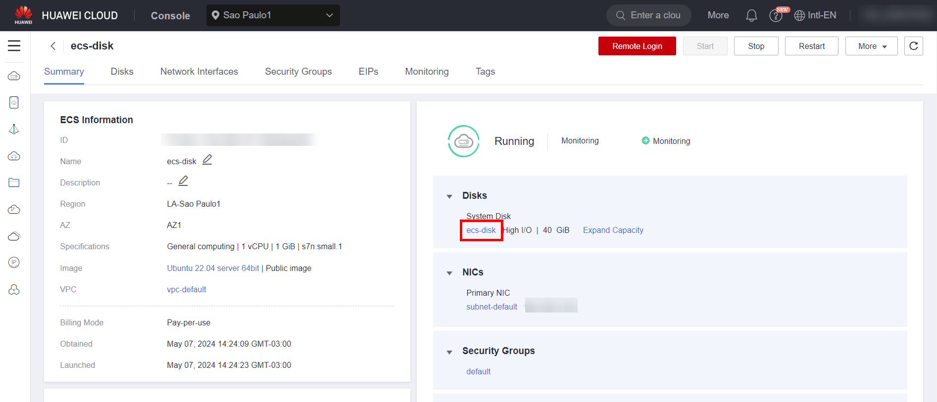 To expand a server’s disk, you need to obtain its disk ID. To do this, navigate to the ECS section in the Huawei Cloud console, click the server where the disk is mounted, and then click the desired system disk: