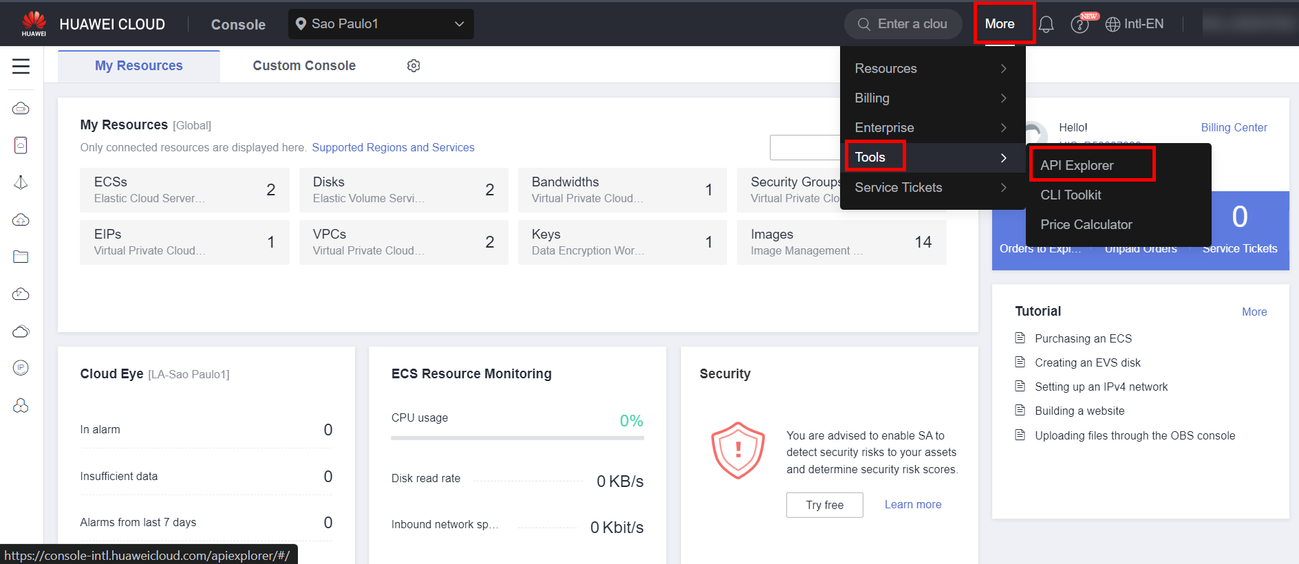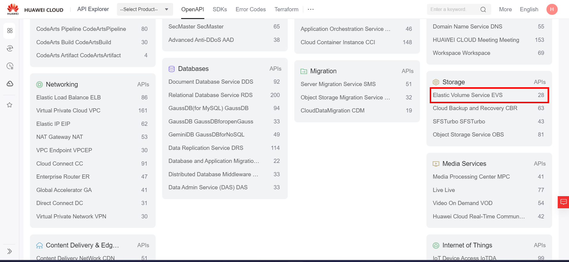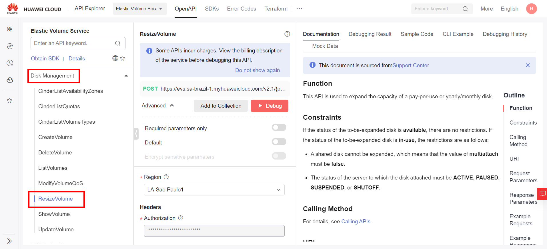 After obtaining the ID of the disk to be resized, navigate to the API Explorer section of the Huawei Cloud console by hovering over “More”, “Tools”, and “API Explorer”. Select the “Elastic Volume Service EVS” section, and then select the “ResizeVolume” API. Alternatively, click the following link to go directly to the API: https://console-intl.huaweicloud.com/apiexplorer/#/openapi/EVS/doc?api=ResizeVolume.