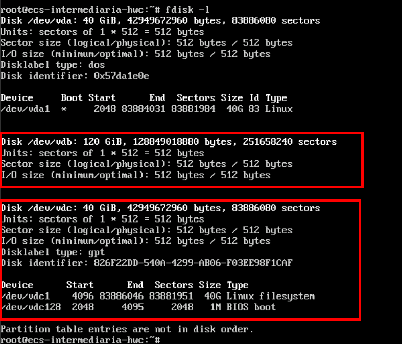 Log in to the intermediate ECS and enter the command “fdisk -l” to list the disks mounted on the ECS. Copy the path of the device whose filesystem is corrupted, such as “/dev/vdc” or “/dev/vdb1”.