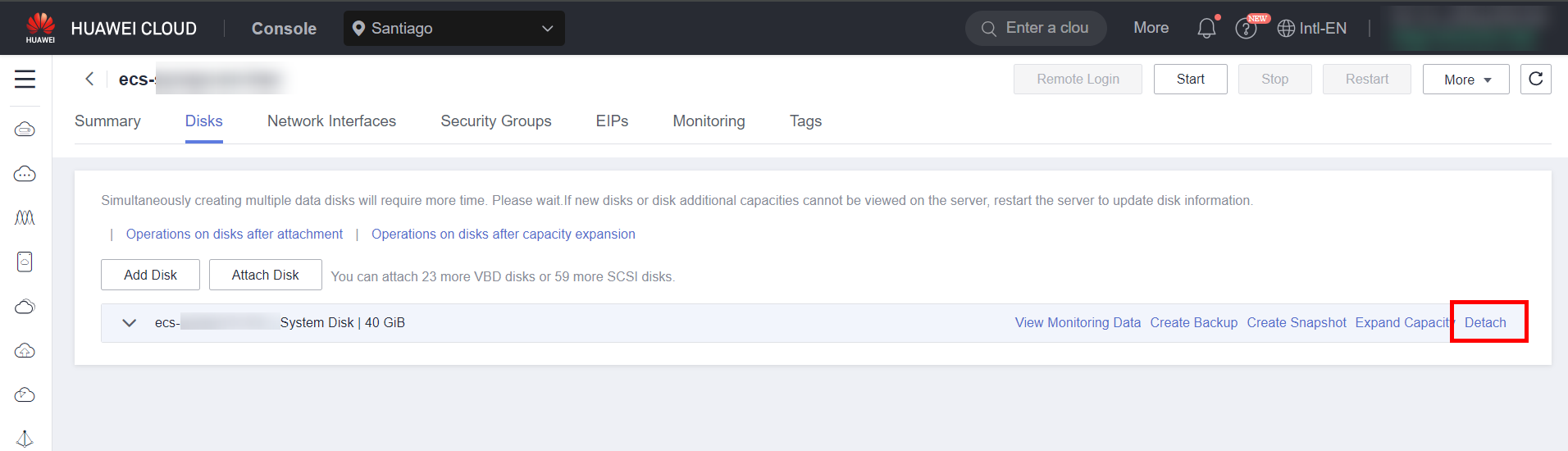 If the migrated machine presents problems during initialization, such as getting stuck in the boot process, it is possible that some adjustments need to be made to the migrated machine. Below is a list of some known errors. If none of the solutions below solve the problem, it is recommended that a ticket be opened so that the experts can investigate the problem more precisely. To perform the following configurations, it will be necessary to remove the system disk of the migrated machine as a data disk in an intermediate ECS as follows. After creating a new ECS in the HWC console, mount the disks on the intermediate machine. First, remove the damaged disks from the original ECS and then place them in the intermediate ECS.